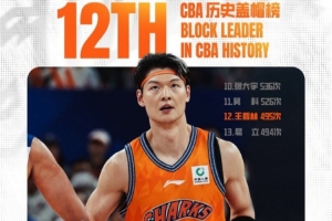 比赛进行到第二节,王哲林送出个人本场第2次盖帽。至此,王哲林CBA生涯盖帽总数上升至495次,超越易立的494次,升至CBA历史盖帽榜第12位!