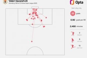 25 – 卡扎伊什维利本赛季在运动战中攻入25粒进球,刷新自有纪录以来(2012年),任一球员单赛季中超运动战进球新高。