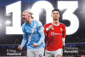 哈兰德在英超联赛中用114场比赛就打入了104球,在英超进球数上正式超越了C罗的103球(236场)!