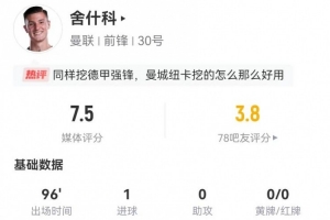 体育资讯1月12日讯 曼联在本轮足总杯1-2不敌布莱顿,舍什科本场数据如下: