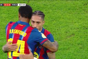 西班牙超级杯决赛,巴萨3-2击败皇马夺冠。拉什福德第83分钟换下拉菲尼亚,第95分钟时巴萨3-2领先皇马,拉什福德跑出半场大单刀,慢悠悠错失良机。转过头来皇马进攻,姆巴佩直塞禁区,居莱尔下底倒三角,卡雷拉斯点球点附近直面球门的推射被霍安没收,巴萨险些被绝平,拉什福德几乎全程眼神防守。