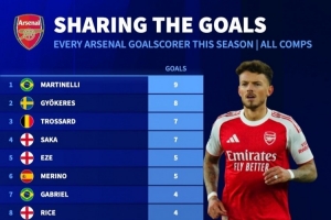 阿森纳本赛季16人取得进球: