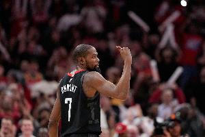 上半场比赛,杜兰特手感不是很好,他出战18分23秒,投篮13中3,三分2中0,罚球4中4,得到10分2篮板1助攻3抢断。