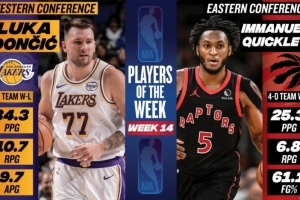 体育资讯1月27日讯 今日NBA官方宣布,湖人球星卢卡·东契奇和猛龙后卫奎克利分别当选本赛季第14周西部和东部周最佳球员。