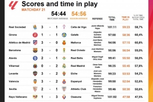 体育资讯1月27日讯 数据显示,西甲第21轮没有任何一场比赛的净时间超过了60分钟,平均净时间为54分44秒。