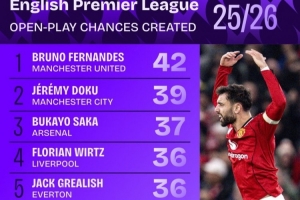 体育资讯1月27日讯 Squawka统计本赛季至今英超球员运动战创造机会次数,B费42次居首,多库39次第二,萨卡37次第三。