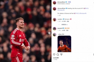 麦卡利斯特也在赛后通过社媒晒出自己的庆祝照,并配文:“ 晋级欧冠16强战🎯@利物浦”。