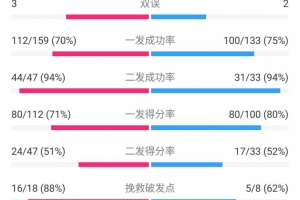 挽救破发点:16/18(88%)比5/8(62%)