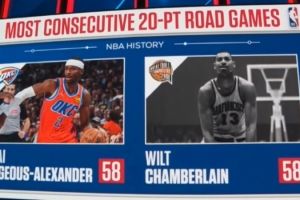 此外,值得注意的是,亚历山大目前连续58场客场得分20+,已经追平了张伯伦保持的NBA历史纪录!
