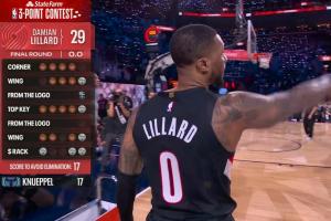 第二位出场的利拉德依然延续了首轮的炸裂手感,中圈5个点全中拿下29分的高分;