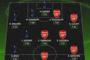 中场:贝尔(热刺)、莫德里奇(热刺)、法布雷加斯(阿森纳)、卡索拉(阿森纳)、桑切斯(阿森纳)