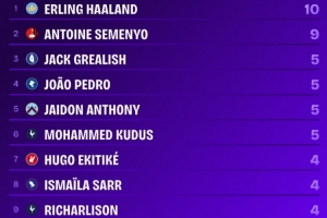 1、哈兰德(曼城):10球