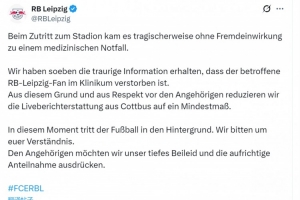 莱比锡俱乐部确认,一名莱比锡球迷进入球场时发生紧急医疗情况(与外部因素无关),被送往医院,最终在医院去世,莱比锡俱乐部社媒因此将这场比赛的直播报道减少到最低限度,并向家属表示深切慰问。