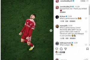 布拉德利当选本场比赛利物浦队内最佳球员,赛后他在社交媒体上晒出照片,配文:“享受这场比赛,谢谢安菲尔德。”